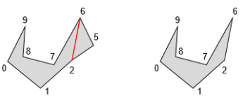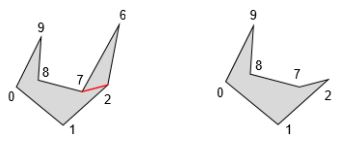 이를 가상 연결선으로 인해 겉보기엔 간단한 다각형과 비슷하나, 두 개의 간선이 같은 위치에서 반대 방향으로 존재하므로 가상 간단 다각형(pseudosimple polygon)이라 칭합니다.