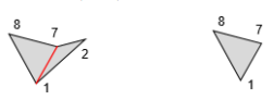 At this time there is no need to update the reflect or ear lists because we detect that only three vertices remain. The last triangle in the triangulation is T7 = ⟨7, 8, 1⟩. The full triangulation is show in Figure 9.
