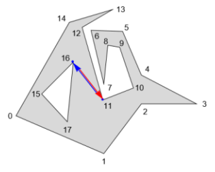 정점 $V_{11}$(외부 다각형)과 정점 $V_{16}$(내부 다각형)을 연결하여 구멍을 제거한 새로운 외부 다각형은 다음과 같습니다.