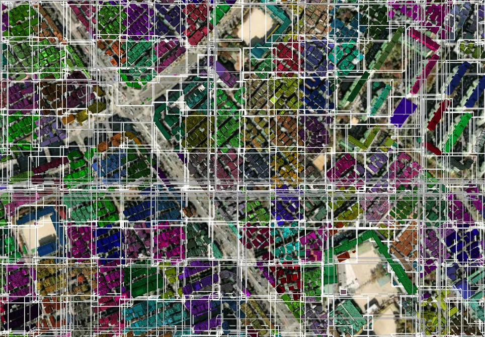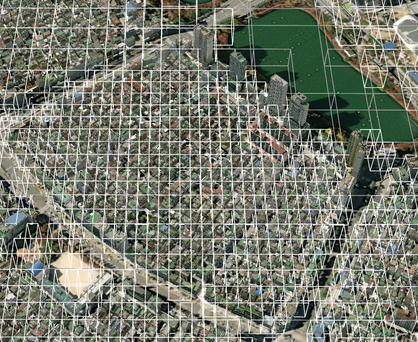 기존 3D GIS 엔진은 3D 공간 데이터를 3D 모델로 만든 후, 해당 모델들의 정보(Geometry + Bounding Volume)를 가지고 일정한 사이즈(예: 100m) 단위로 묶어 쿼드트리 JSON 파일에 명시적으로 저장하고 탐색하는 구조였습니다.
