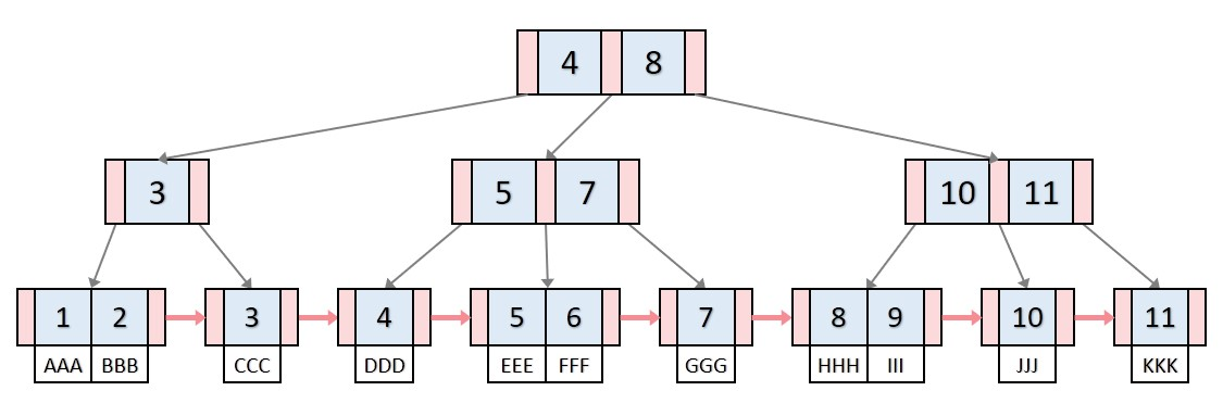 | 범위 검색 / 순차 접근 | 리프 노드 간 연결이 없어 비효율적 | 리프 노드가 연결 리스트로 이어져 있어 범위 검색 최적화 |