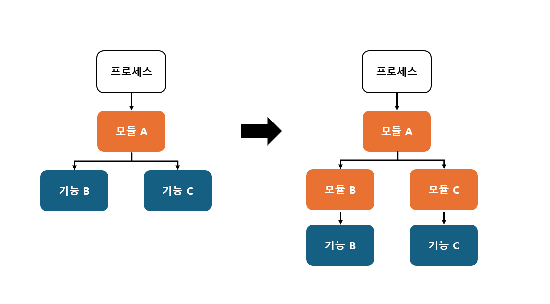 모듈화 후: 프로세스가 1개의 모듈을 실행하고, 해당 모듈에서 여러 모듈을 실행하는 구조 (모듈 : 내부 기능 = 1: 1)