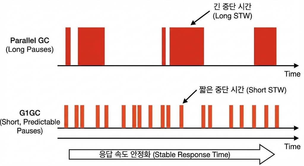 | 기본 GC | Parallel GC (처리량 중심) | G1GC (지연 시간/응답성 중심) |